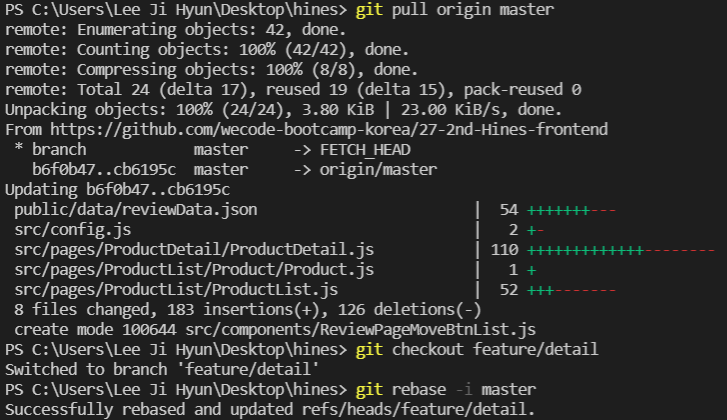보통 git rebase 를 하기 전에 main 브랜치에서 git pull 해주는 것은 필수이다. 또한 현재 작업하고 있는 브랜치로 가서 "git rebase -i master" 명령어로 git merge 와 같은 역할을 해줘야 브랜치가 최신 상태로 업그레이드 된다.