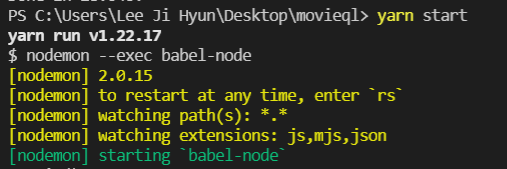 package.json 파일에 위와 같이 작성하면 nodemon 이 babel-node와 index.js 를 실행해줄 것이다.