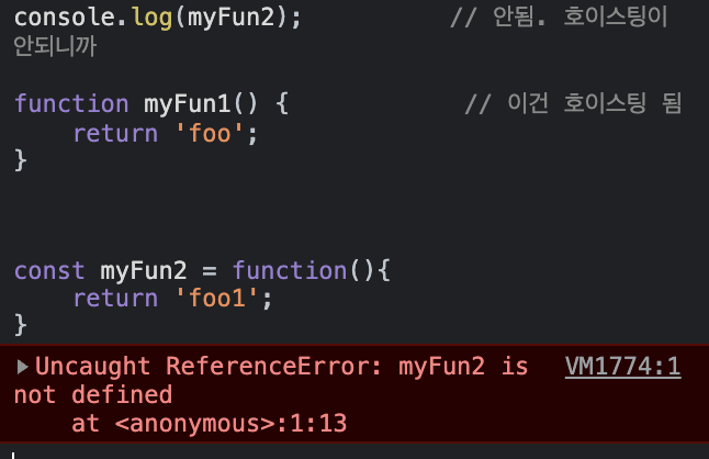 console.log(myFun2) // 안됨. 호이스팅이 안되니까