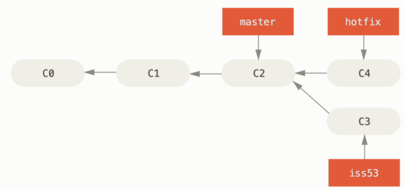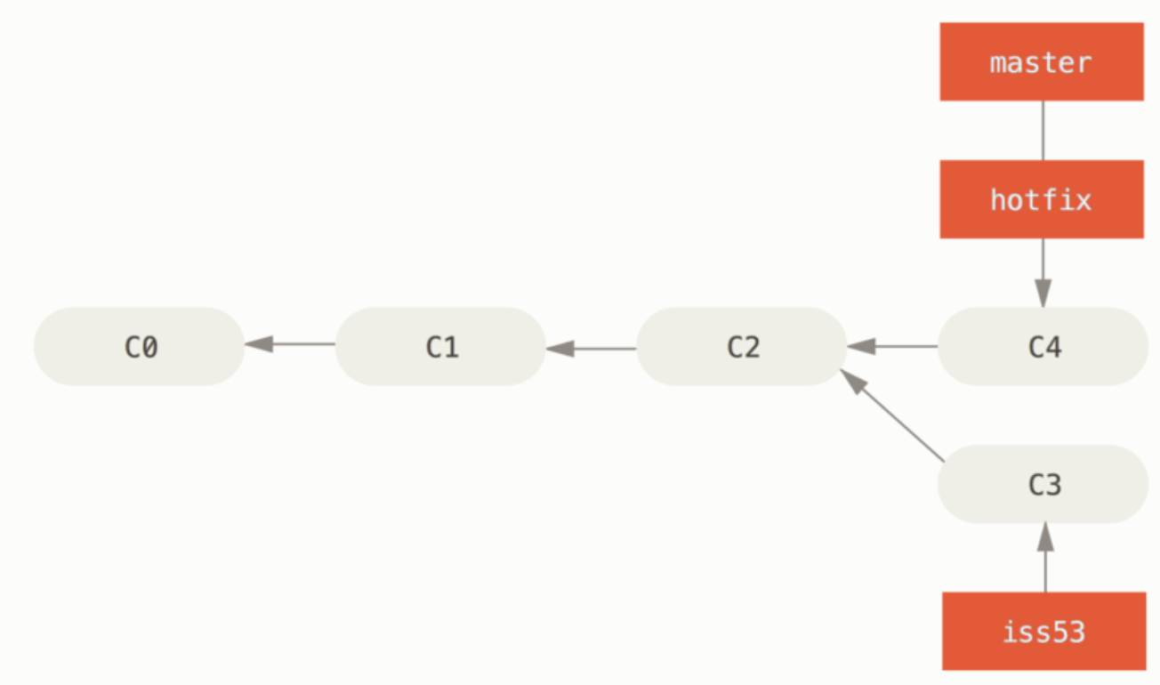 위에서 작업한 hotfix 가 iss53 브랜치에 영향을 끼치지 않는다는 점을 이해하는 것이 중요하다.