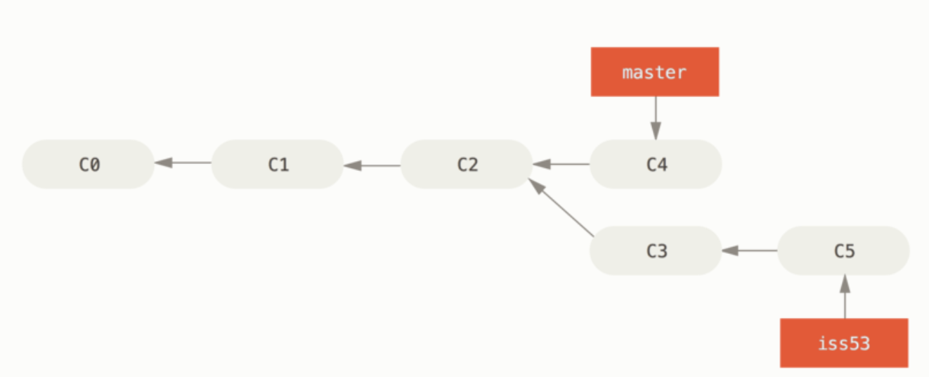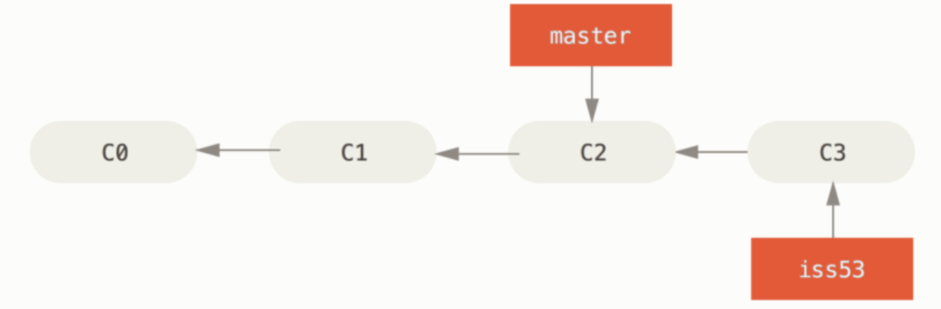iss53 브랜치를 Checkout 했기 때문에(즉, HEAD 는 iss53 브랜치를 가리킨다) 뭔가 일을 하고 커밋하면 iss53 브랜치가 앞으로 나아간다.