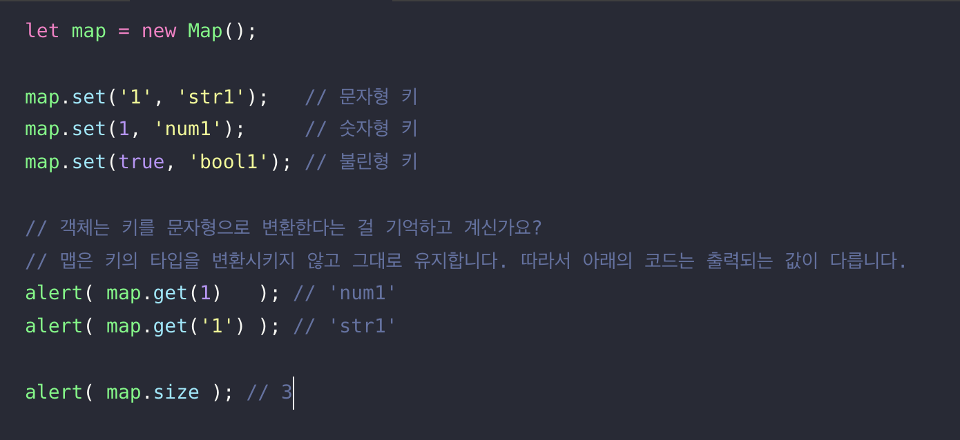 map[key] = 2로 값을 설정하는 것 같이 map[key]를 사용할 수 있긴 합니다. 하지만 이 방법은 map을 일반 객체처럼 취급하게 됩니다. 따라서 여러 제약이 생기게 되죠.map을 사용할 땐 map전용 메서드 set, get 등을 사용해야만 합니다.