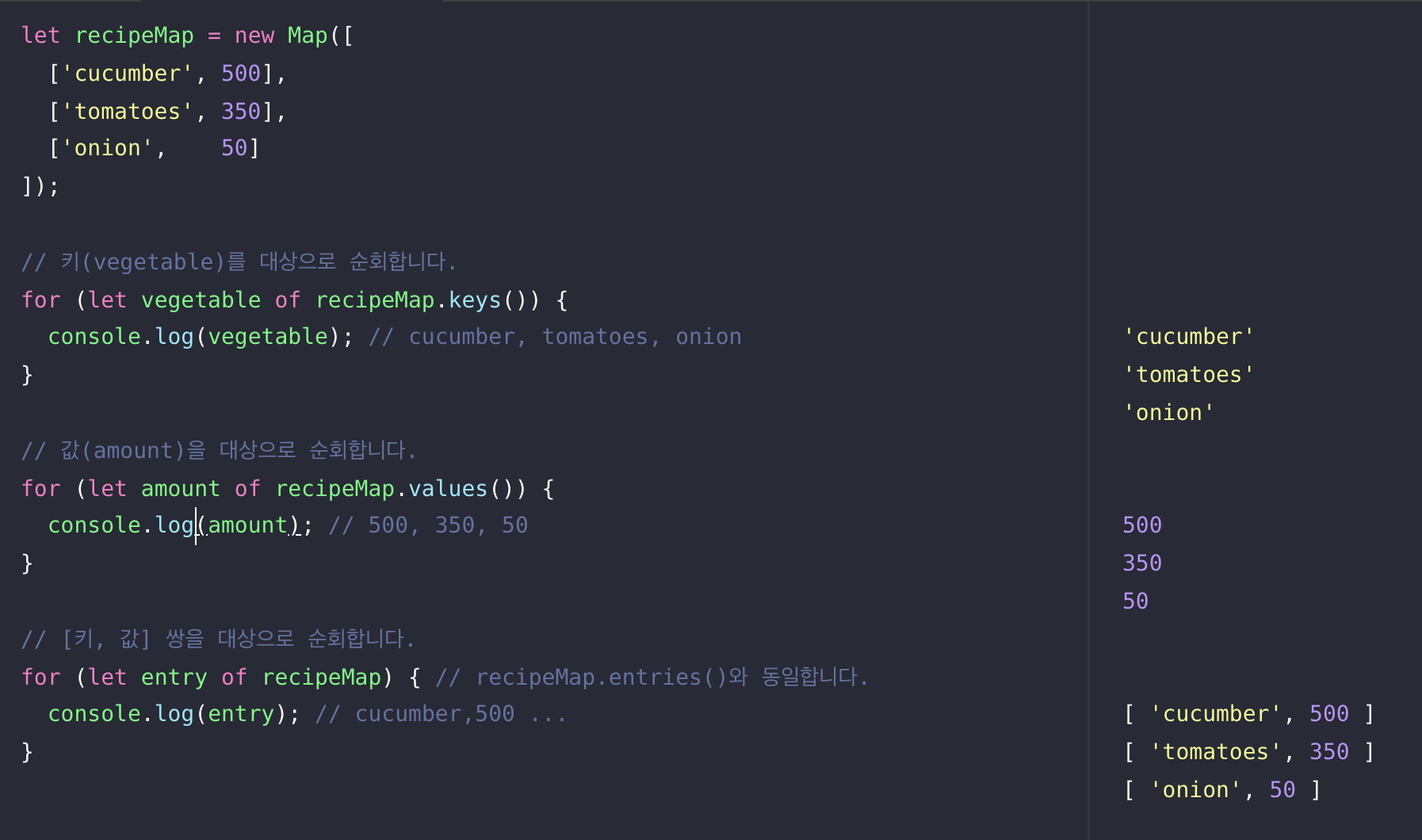 - map.entries() – 요소의 [키, 값]을 한 쌍으로 하는 이터러블 객체를 반환합니다. 이 이터러블 객체는 for..of 반복문의 기초로 쓰입니다.