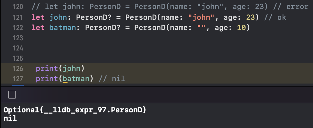 // let john: PersonD = PersonD(name: "john", age: 23) // error --> 옵셔널 타입으로 지정해줘야 함