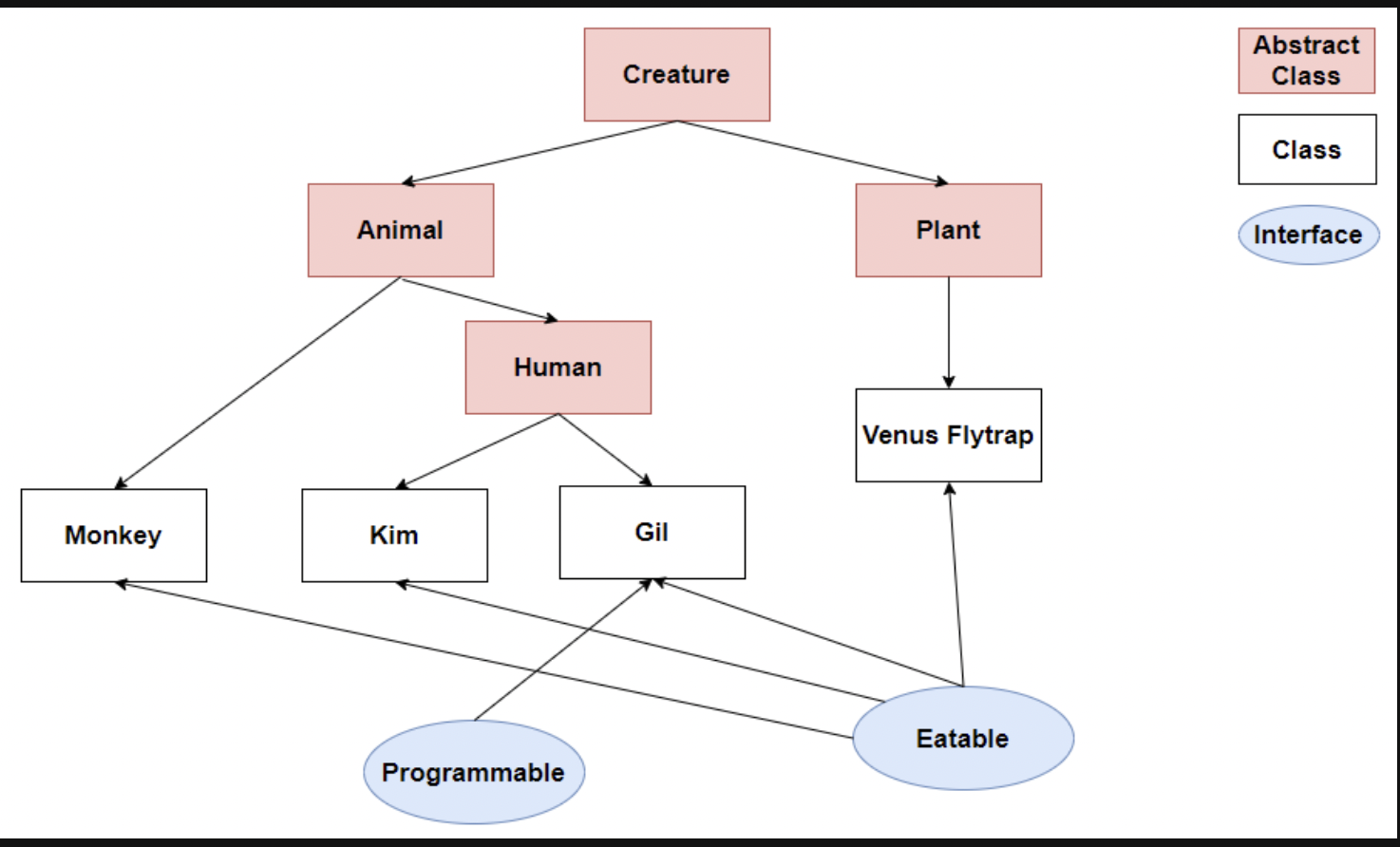 여기서 Interface의 사용 목적을 알 수 있는데, Eatable Interface를 사용함으로써 Animal, Plant 각각 다른 부모 Class를 상속받고 있는 Monkey, Kim, Gil, Venus Flaytrap에게 공통적인 기능인 먹는 기능을 Interface를 사용함으로써 상속 관계가 다름에도 기능을 구현하도록 강제 할 수 있다.