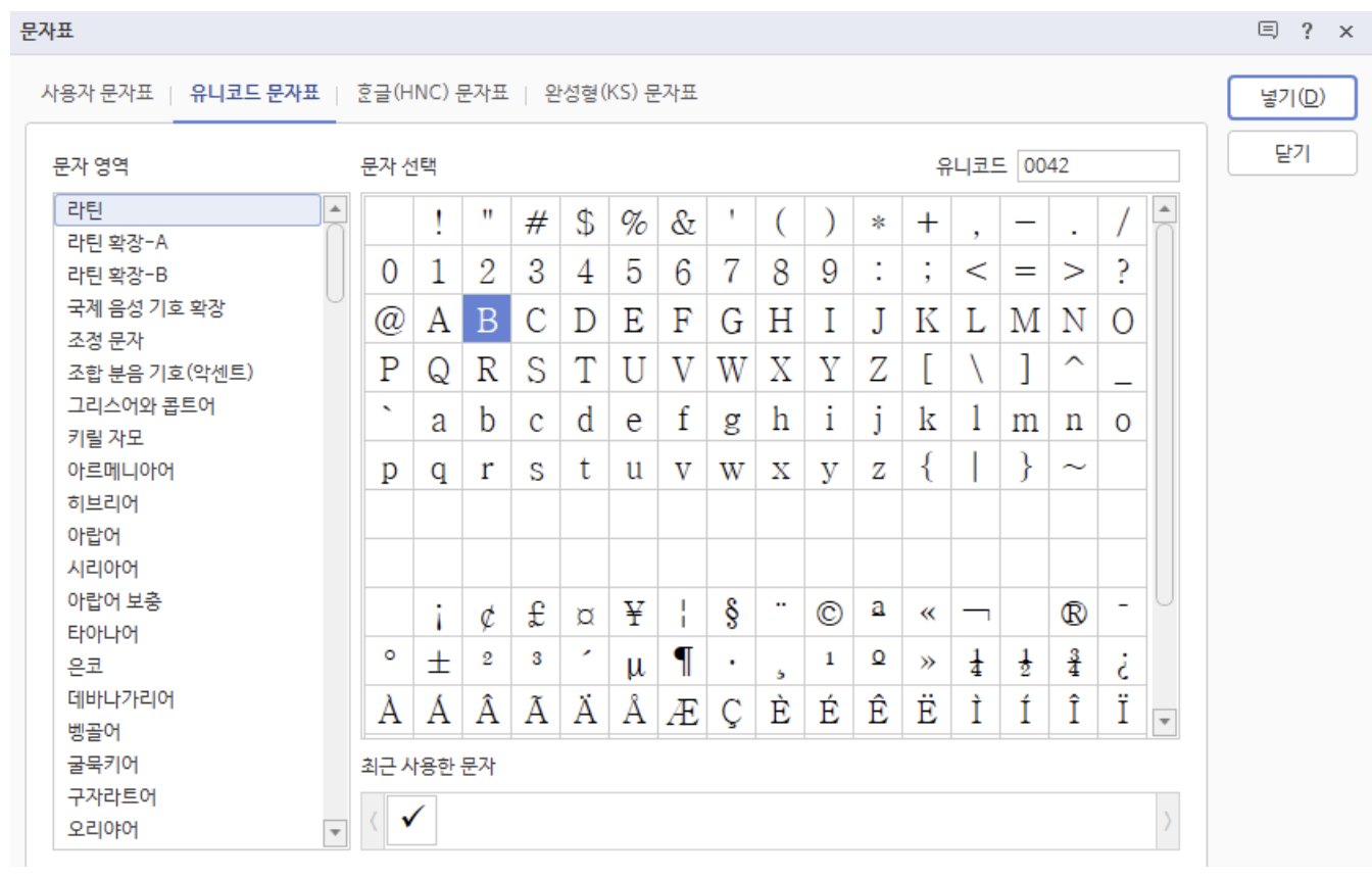 한글 프로그램을 사용해 본 사람이라면 유니코드 문자표를 본 적이 있을 것이다. 이처럼 유니코드는 알파벳뿐만 아니라 다양한 언어, 기호, 이모티콘 등등 엄청나게 많은 문자들을 표현할 수 있다.