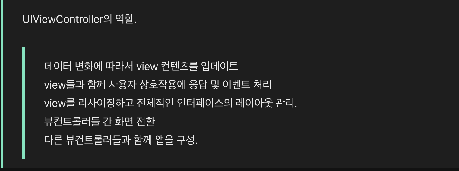 이는 앱의 근간을 이루는 객체로 모든 앱은 최소한 하나 이상의 뷰 컨트롤러를 가지고 있는데, 한 마디로 사용자가 화면을 보는 것에 대한 관리기능을 제공하는 객체입니다. (xcode에서 프로젝트를 생성하면 기본적으로 ViewController 파일 하나는 이미 존재함)
