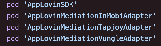 - pod 'AppLovinMediationVungleAdapter': AppLovin 미디에이션에서 Vungle 광고 네트워크를 사용하기 위해 필요한 AppLovin-Mediation-Vungle 어댑터 라이브러리.