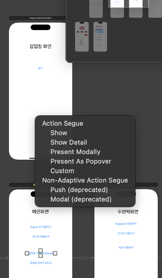위와 같이 메인화면의 버튼을 팝업창 화면으로 드래그하면 창이 뜨는데 여기서 present Modally 를 클릭해준다