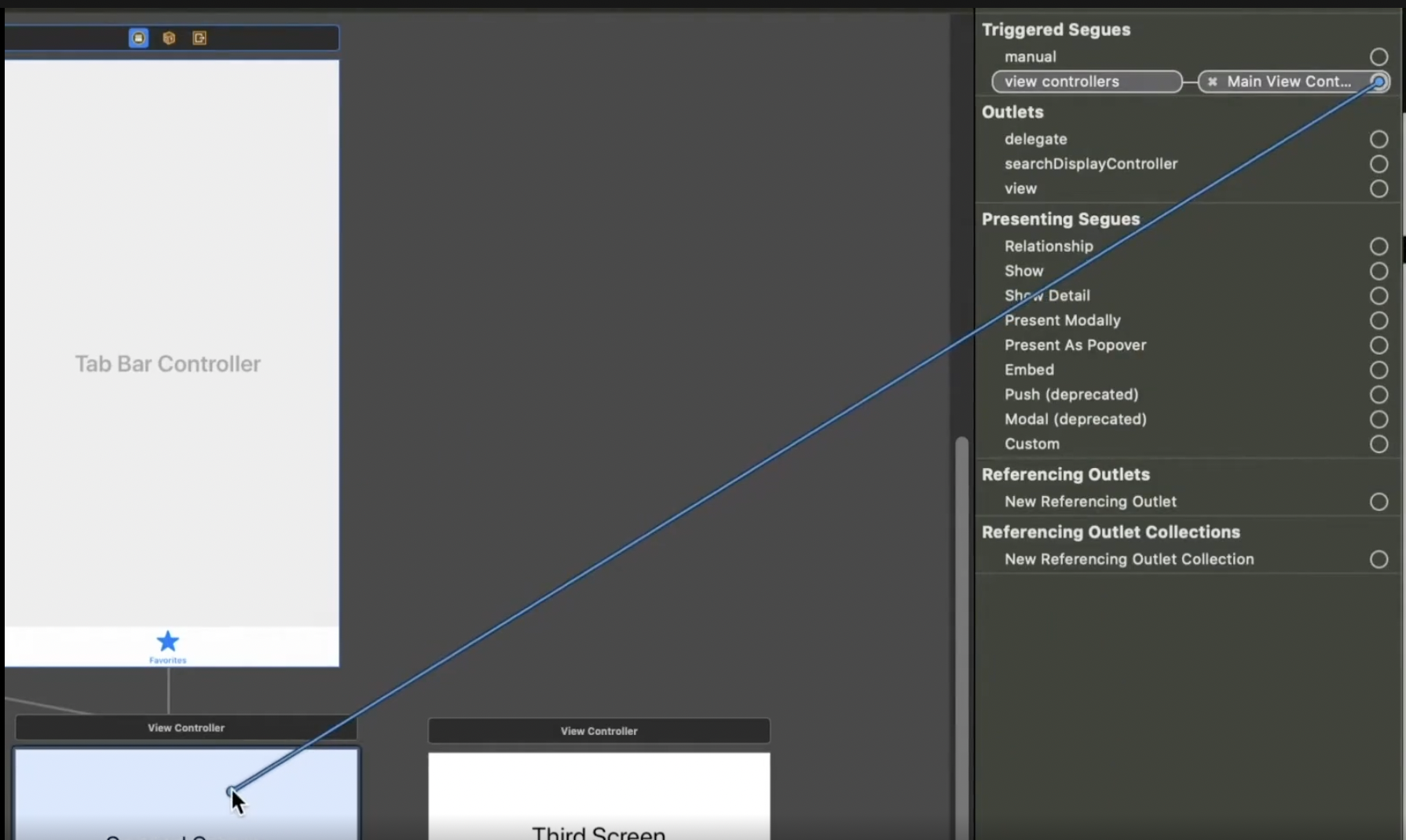뷰 컨트롤러를 먼저 만들고, Tab Bar Controller 에서 아래와 같이 이어준다