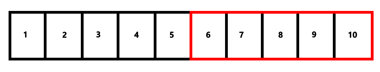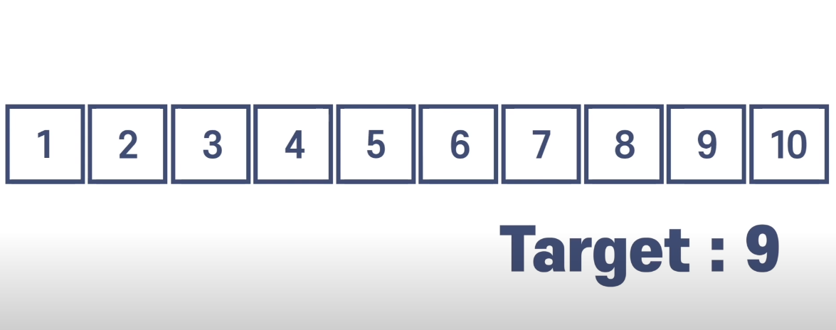 1~10 까지 정렬된 배열에서 이진 검색 알고리즘을 적용해서 9를 검색한다고 할 때, 먼저 중간의 숫자를 먼저 찾는다. 중간의 숫자는 5 이다. 9와 비교 ( 5 < 9 ) 했을때 9는 5보다 크므로 5의 오른쪽을 탐색하게 된다.
