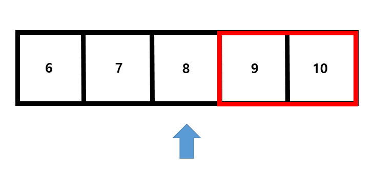 그 다음 6~10까지 탐색할 때는 이전의 방법과 마찬가지로, 중간의 숫자 8을 찾고 검색 목표의 숫자 9와 비교를 한다( 8 < 9 ). 9가 8보다 크므로 탐색의 범위는 6, 7, 8 의 숫자가 무시된 9와 10이 남는다.