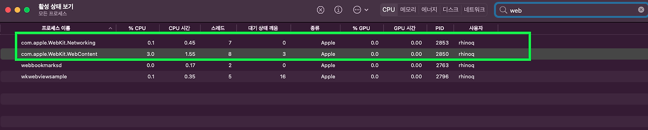 2. "활성 상태 보기" 창에서 "com.apple.WebKit.WebContent" 를 눌러서 종료시킨다