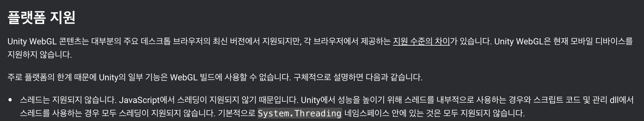 아마 유니티 WebGL 이어서 더 쉽지 않은 일인 것일 수도 있다.. 왜냐하면 WebGL의 JavaScript 환경은 싱글 스레드이기에..