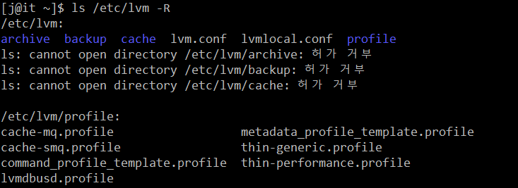 ls /etc/lvm 명령어를 치면 lvm 의 파일/디렉터리 목록들을 보여준다. 여기서 -R 의 옵션을 주게 되면, 아래의 그림과 같다.