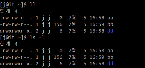 ll : ls 란 해당 디렉토리에 존재하는 파일목록을 표시해주며, ll 이란 ls 명령어에 -l 옵션을 준 형태이다. (참고로, -l 옵션은 long 옵션으로 상세히 출력하라는 의미이다.)