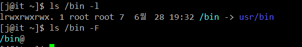 먼저 -l 옵션을 주어 bin 디렉터리 안의 내용은 심볼릭 링크임을 확인했고, -F 옵션을 주어 @가 나옴을 확인했다.