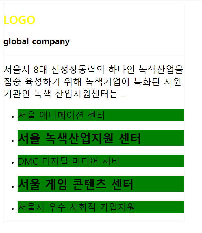<li><h1>서울 녹색산업지원 센터</h1></li>