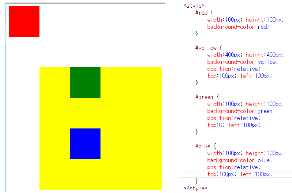 (사실 옐로우의 원래 위치는 레드 바로 밑에 위치하여야 하는데 relative 속성으로 저렇게 떨어지게 된 것이다.)