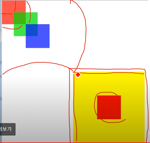 하지만 노랑 안 빨강은 노랑을 기준으로 하기 때문에 노랑으로부터 top, left 만큼 떨어져있다.